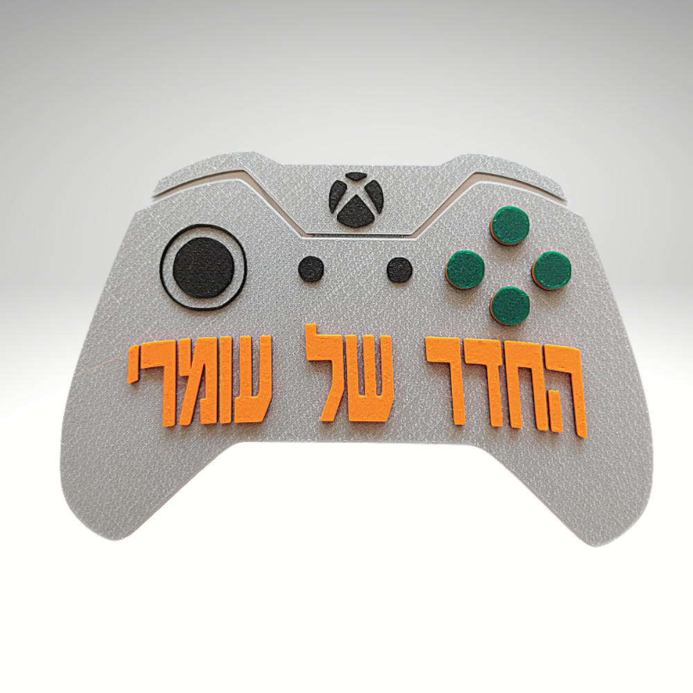 שלט מעוצב, מרהיב וצבעוני לדלת חדר ילדים בצורת שלט אקס בוקס עם כיתוב אישי של שם הילד.