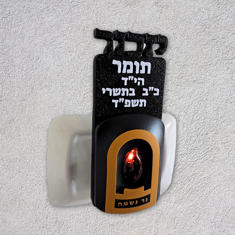 נר נשמה חשמלי המתחבר ישירות לשקע החשמל עם כיתוב אישי של שם הנפטר/ים ו/או תאריך פטירה.
