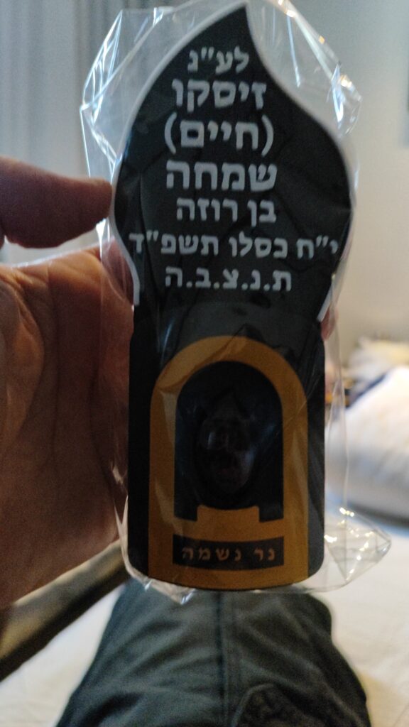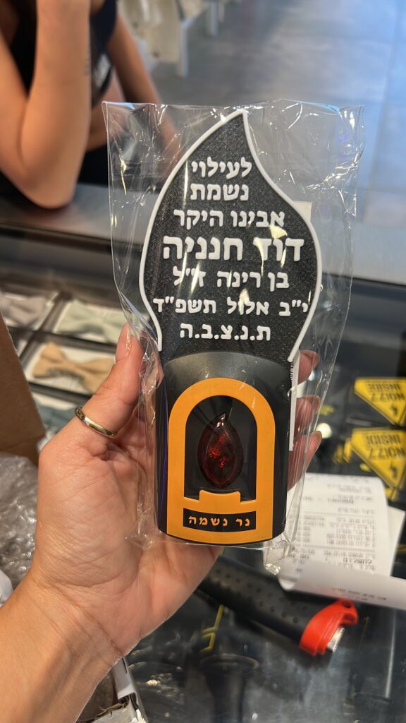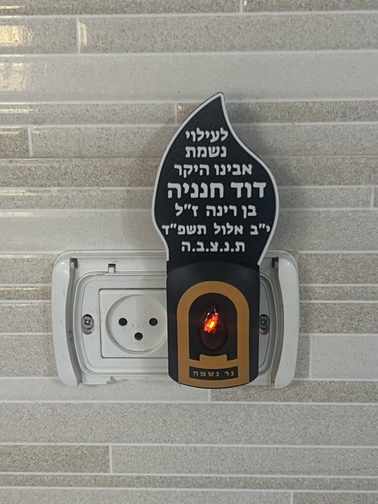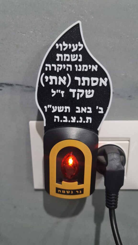נר נשמה חשמלי המתחבר ישירות לשקע החשמל עם כיתוב אישי של שם הנפטר/ים, הקדשה קצרה ו/או תאריך פטירה.