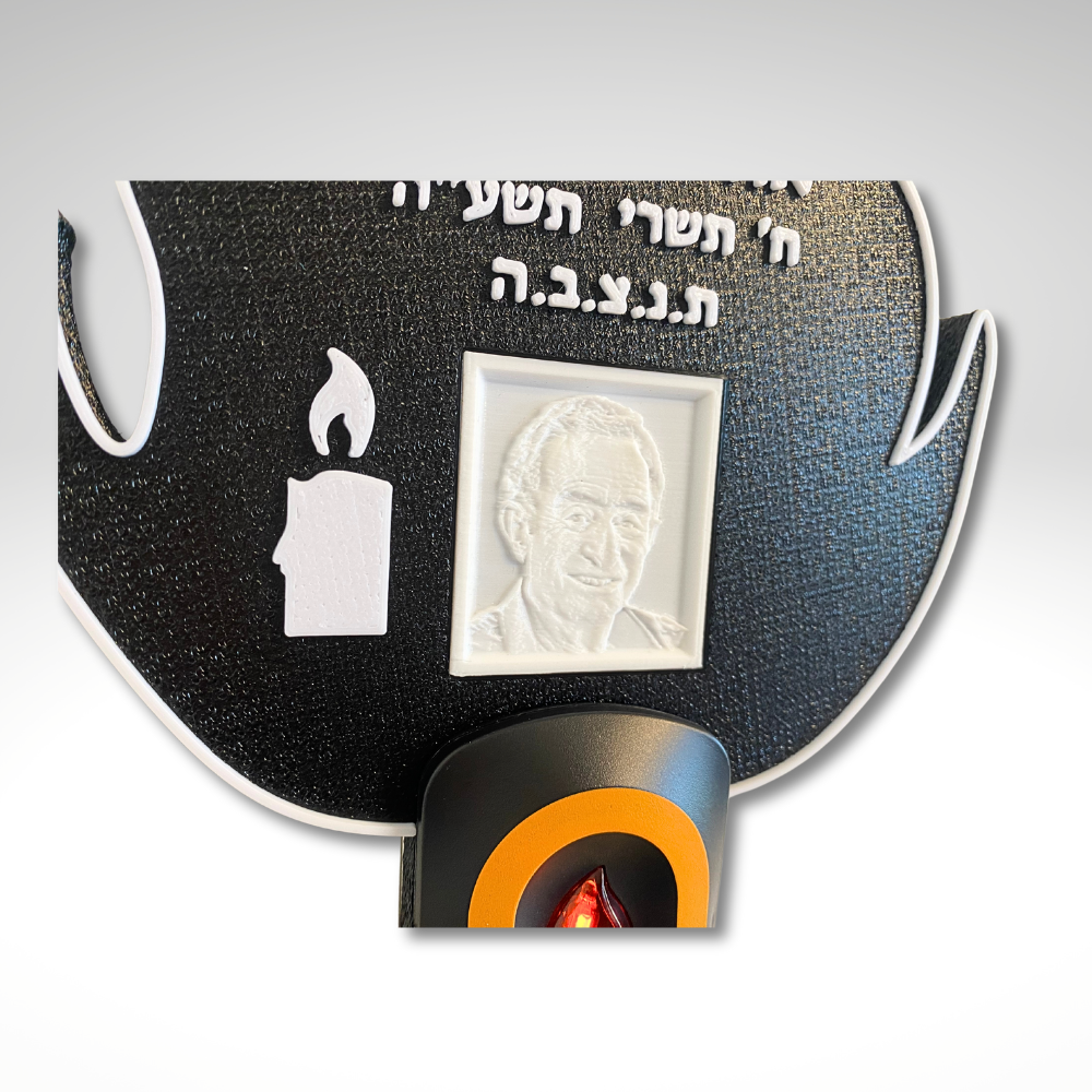 נר נשמה חשמלי המתחבר ישירות לשקע החשמל בצורת להבה גדולה עם תמונת תבליט וכיתוב אישי.