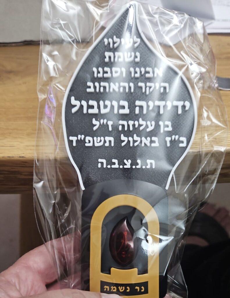 נר נשמה חשמלי המתחבר ישירות לשקע החשמל עם כיתוב אישי של שם הנפטר/ים, הקדשה קצרה ו/או תאריך פטירה.