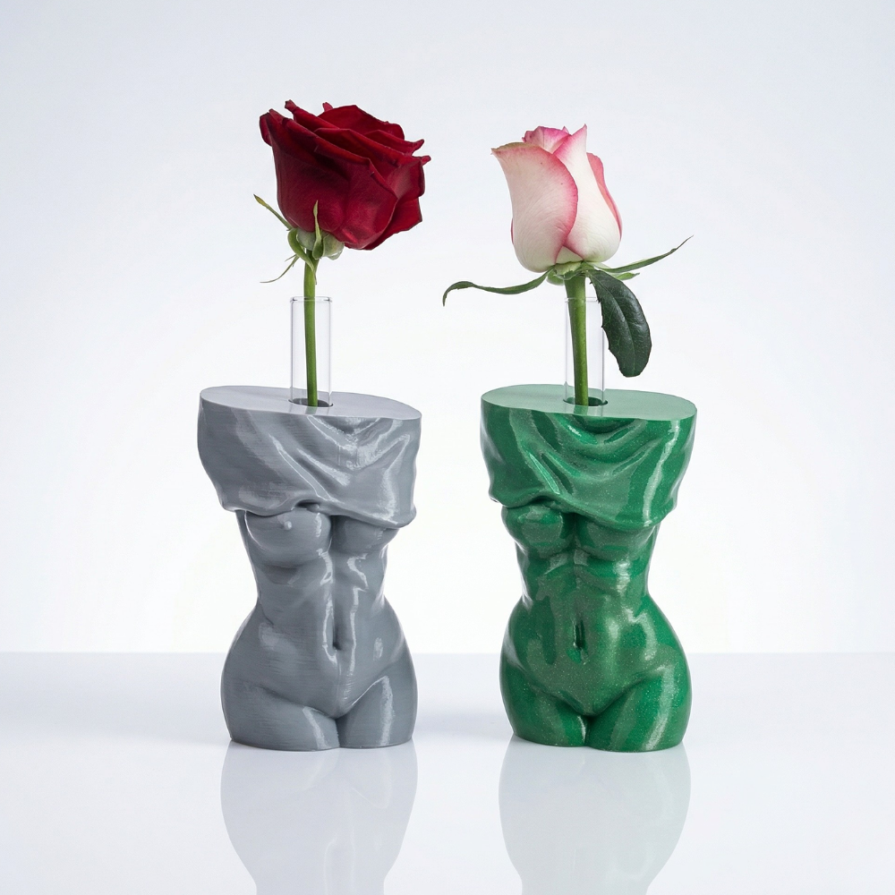 מבחנת הנוי להנחה על מדף בצורת פסל גוף נשי היא פריט קטן שהופך חלל פשוט לפינה מעוצבת עם פסל וצמח.