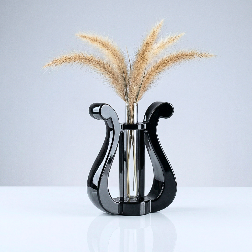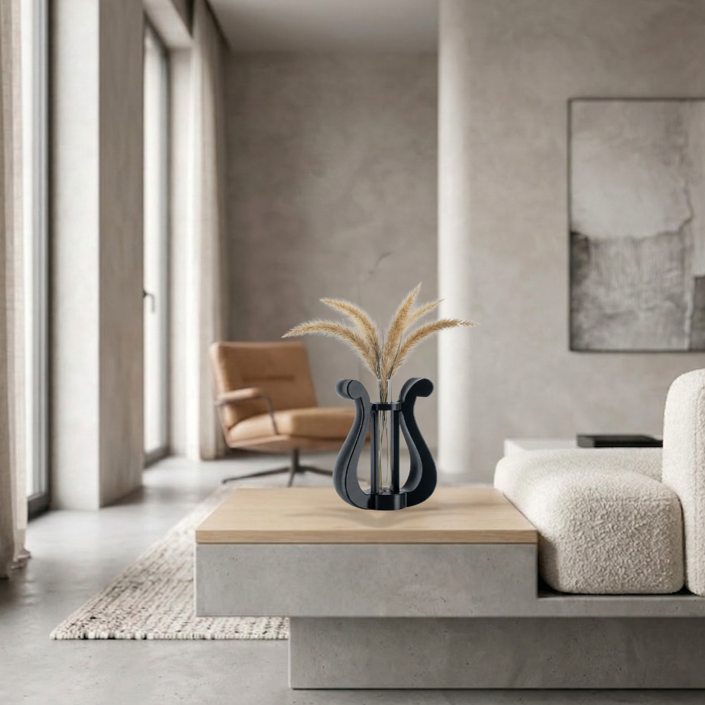 מבחנת הנוי להנחה על מדף בצורת גוף של נבל (Harp) היא פריט קטן שהופך חלל פשוט לפינה מעוצבת, חמה ומלאת אופי.