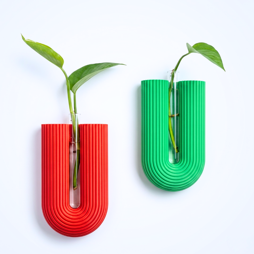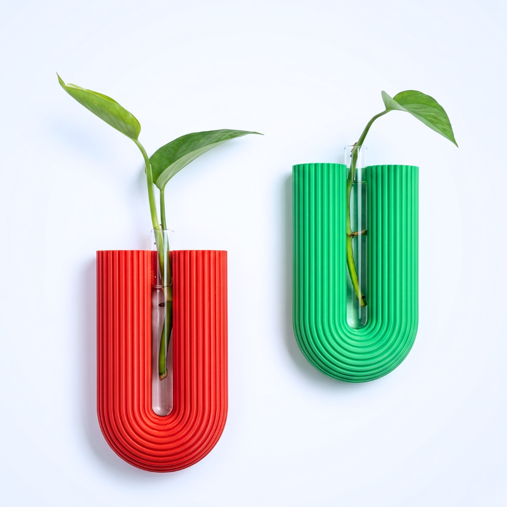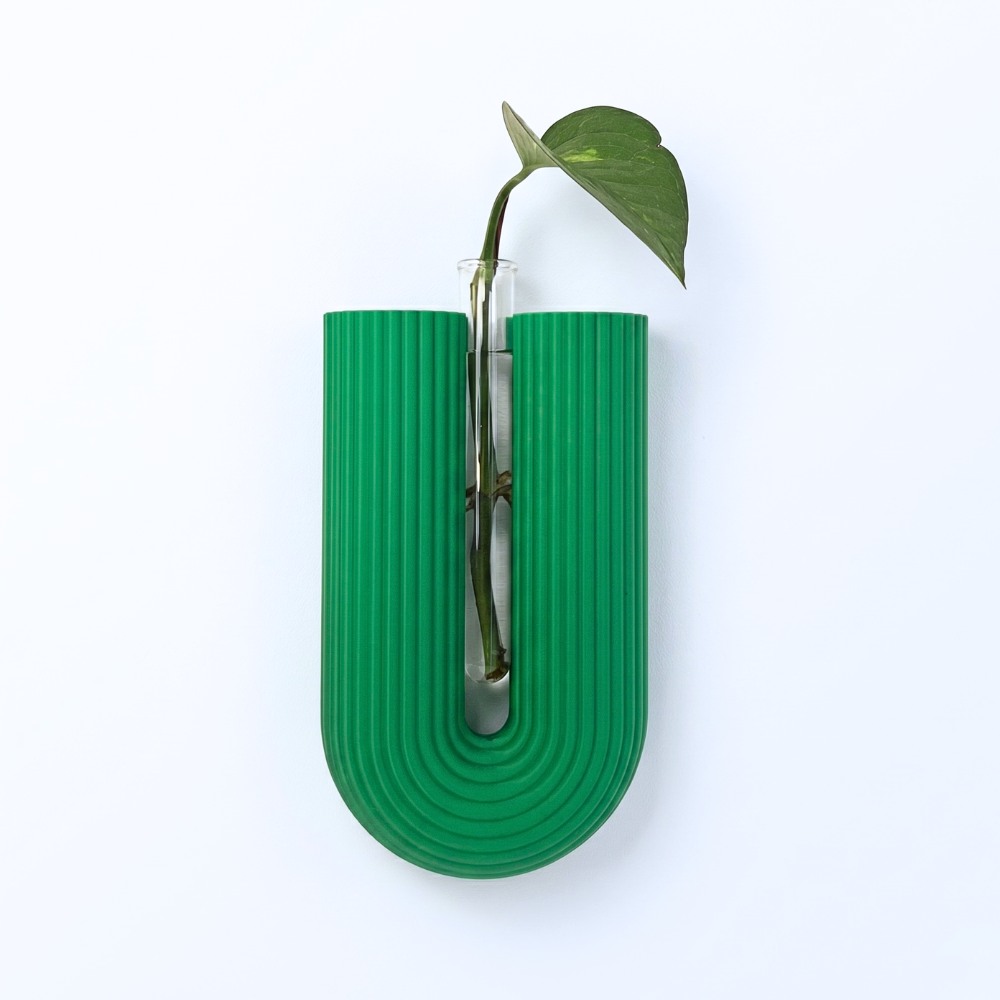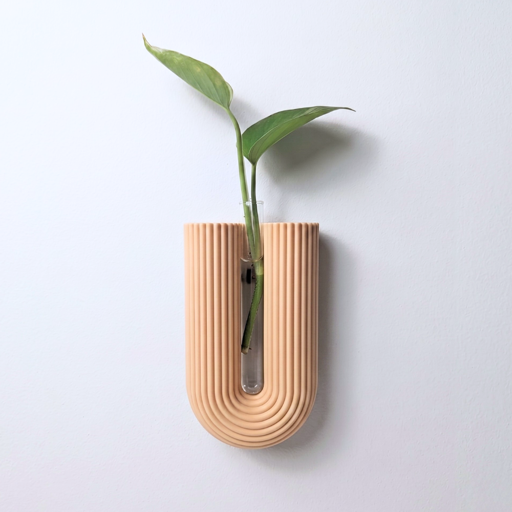 המתלה עוצב בהשראת סגנון מודרני נקי, עם טקסטורה אנכית עדינה שמוסיפה עומק, עניין ותחושת יוקרה. במרכזו משולבת מבחנה שקופה, המתאימה לצמח ירוק, פרח בודד, ייחור להשרשה, צמחי פמפס או סידור עדין ומינימליסטי.